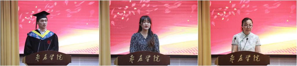 2018级食品质量与安全专业学生吴帅作为毕业生代表发言,他表示毕业生将谨记母校和学院的教诲,扬帆再起航,在人生的新征程中再书华章;2019级制药工程(春)本科1班学生耿琪然代表在校生发言,对即将毕业的学长们送去深深的祝福;教师代表毕海丹代表全院教师送上师长的嘱托和学院的祝福。学生代表为教师敬献鲜花,倾心话别,深切表达了对师长的无限感激。