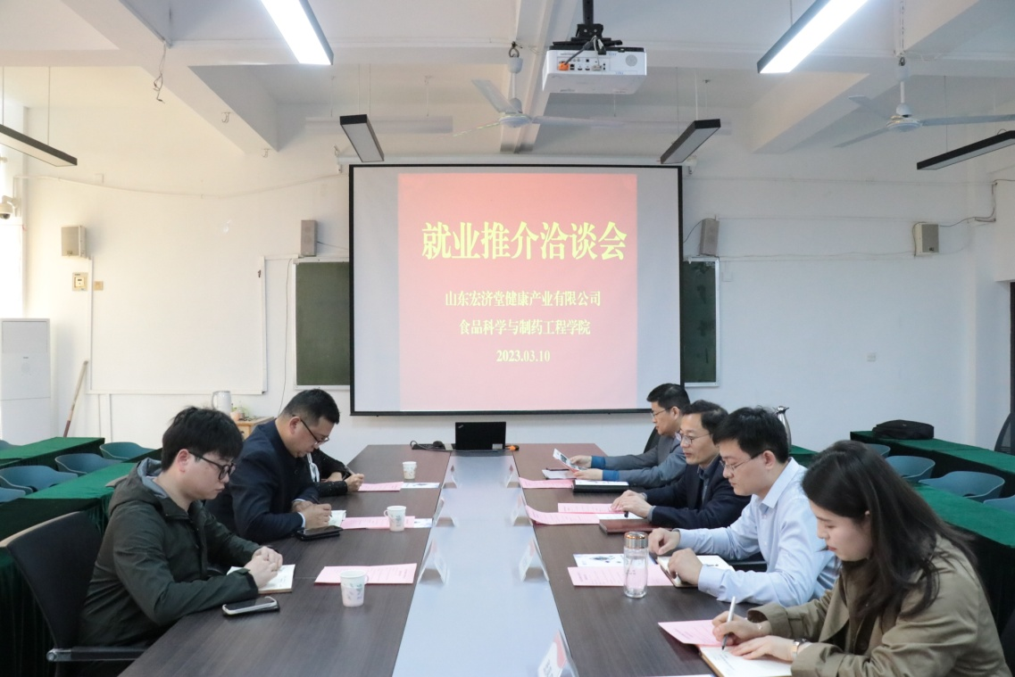 洽谈期间,党总支书记滕聿峰首先致欢迎辞,介绍了学院办学理念、学科特色、产学研发展以及人才培养等方面情况。接着张一泉先生对山东宏济堂健康产业有限公司品牌文化发展战略、人才需求和员工薪资福利待遇等方面内容进行了全方位推介。随后双方就校企合作、科研成果转化、实习实践基地建设等方面合作事项开展了深入交流;最后企业负责人面向2023届毕业生从应聘简历制作、仪容着装要求、面试技巧等方面进行了辅导,对有求职意向的同学进行了现场面试。此次就业招聘活动取得了圆满成功。