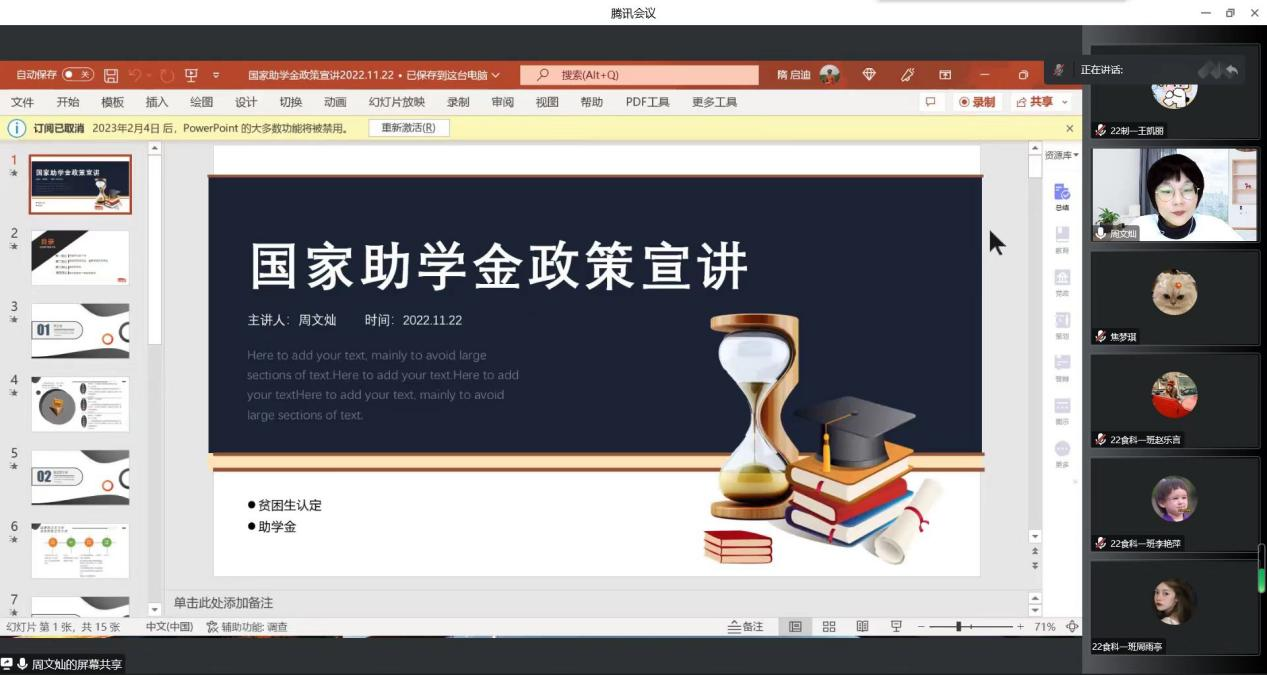 为全面推进资助育人,增强资助政策的宣传力度,增进学生对资助政策的了解和认识,今年会于11月22日在线上举办国家助学金政策宣讲会。本次会议由学院辅导员周文灿老师担任主讲,2022级全体学生参加。